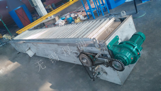 用于傳動的牽引鏈采用不銹鋼制造,鏈具有足夠的斷面尺寸,牽引鏈破斷強度不小于其它大牽引力的5倍。傳動用的牽引鏈輪及導向裝置(非鏈輪),分別置于機架兩側的上部和下部,水下導向裝置的形式,在結構上有可靠的設施防止柵渣等污物的纏繞。導向裝置是非鏈輪機構。